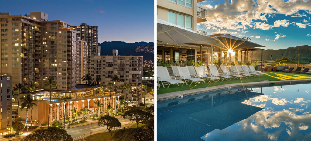 Alohilani (previously known as the Pacific Beach Hotel) offers chic, spa-like rooms, each with its own private balcony and expansive views of the ocean and/or Diamond Head. Across the Kalakauha street from the Kuhio beach section of Waikiki, a main feature of the hotel is the 280,000 gallon Oceanarium. But it also comes with other creature comforts, including a full-service spa, a saltwater infinity pool, a Kid’s club and kiddie pool, and a fitness center complete with tennis courts and yoga classes. Foodies will also love the two restaurants— one casual, one fine dining—by Iron Chef Masaharu Morimoto. Bonus: Alohilani Resort is powered by 100% renewable electricity, and has pledged to plant 100,000 indigenous trees with the Hawaii Legacy Reforestation Initiative. So don’t be surprised when you see a $5 “tree fee” on your bill.