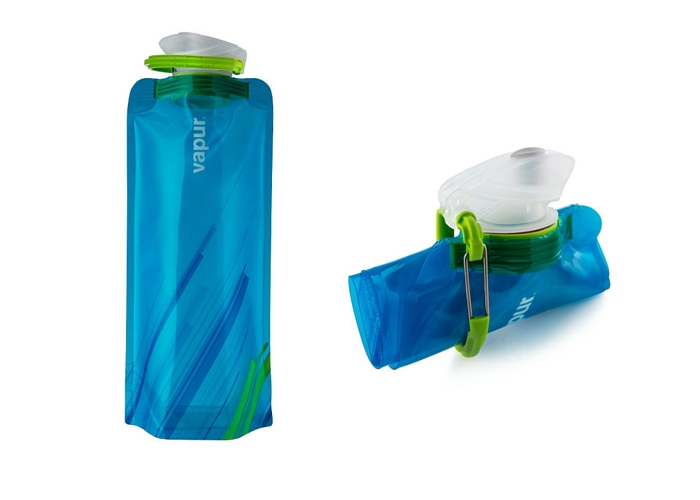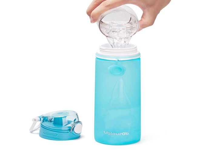 This collapsible water bottle is made of a durable silicone material, which makes it leak-proof but also very flexible. For easy storage, roll it up and secure with the rubber strap. The sleek bottle also comes at a fair price.