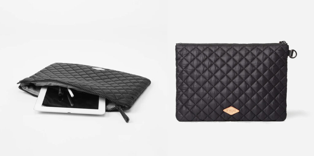 It’s a clutch, it’s a pouch, it’s a diaper holder, it’s anything you need it to be. We adore this bag for its nylon quilted material and packability.